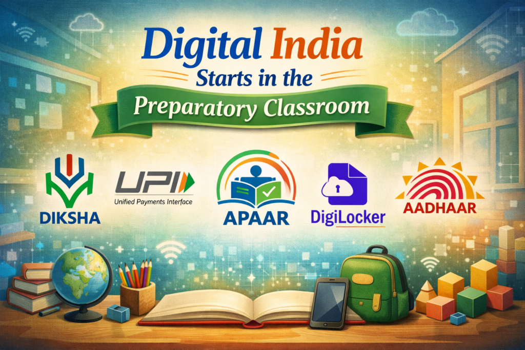 Digital India begins in the preparatory classroom, where children take their first steps into structured learning. At this stage, teachers play a vital role in building digital awareness, promoting safe practices, and using technology meaningfully for learning and parent communication. Government initiatives such as DIKSHA, UPI, APAAR, DigiLocker, and Aadhaar support teachers and families by making education systems more accessible, organised, and efficient. By understanding and responsibly using these tools, educators help lay a strong foundation for children to grow confidently in an increasingly digital world.