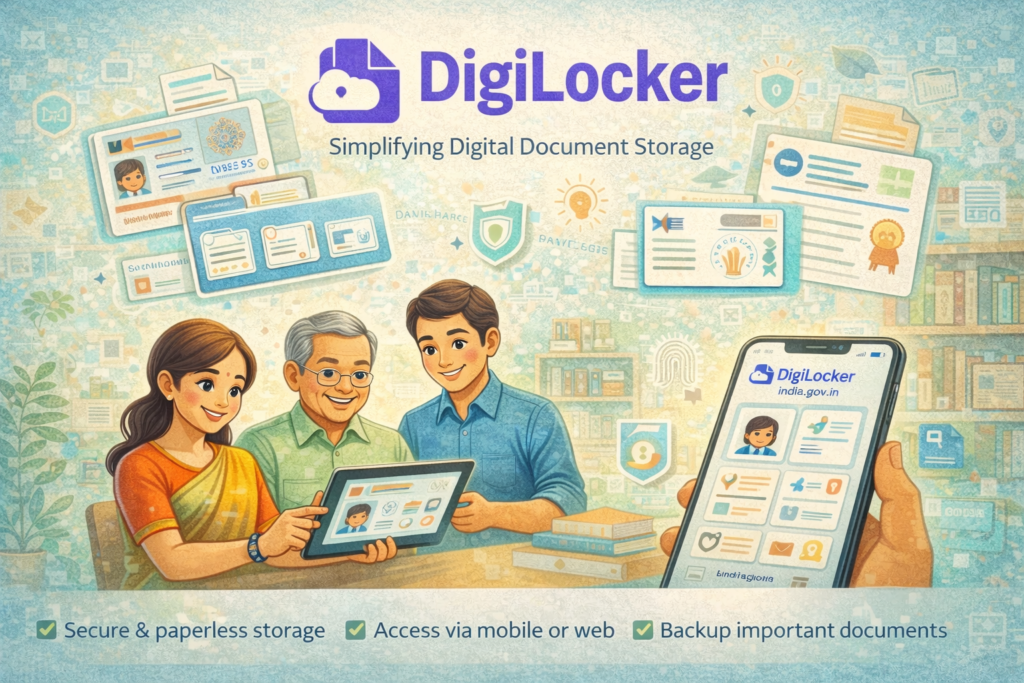 DigiLocker is a secure digital platform introduced by the Government of India to store, access, and share important documents online. It reduces the need to carry physical documents and helps families and institutions manage records safely in digital form.