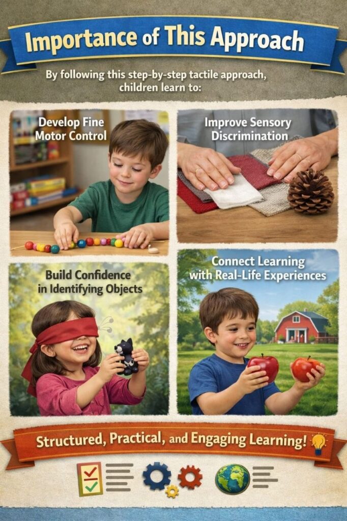 By using simple, hands-on activities with everyday materials, children get the opportunity to explore, feel, and understand the world through touch. This step-by-step tactile approach helps improve sensory discrimination, strengthens finger movements, enhances memory, and builds confidence in independent identification.